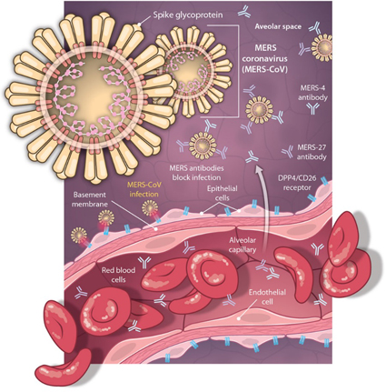 到目前为止,在临床上还没有针对MERS冠状病毒的特异性治疗药物和预防性疫苗。科研团队首先利用蛋白质晶体学方法,解析了MERS冠状病毒膜蛋白的受体结合域与人受体DPP4胞外结构域复合物的三维结构,揭示了MERS冠状病毒侵染细胞的分子机制,并进一步筛选获得两株针对MERS冠状病毒高中和能力的全人源单克隆抗体MERS-4和MERS-27,可高效抑制MERS冠状病毒的感染和传播。其作用机理主要是通过阻断细胞表面受体与病毒的受体结合域相互作用。通过深入的结构和功能分析,课题组揭示两株抗体识别病毒表面膜蛋白不同的表位,联合使用这两种抗体,可以显著提高抗病毒的协同性和广谱性。