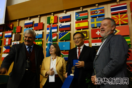 图为ICCROM总干事迪卡罗博士(左一)、ICCROM Award奖评选委员会主席帕克女士(左二)和ICCROM理事会主席格雷兰•鲁克先生(右一)向吕舟教授颁发2012-2013年度ICCROM Award大奖。