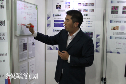 图为特等奖作品《多光照环境下的第一人称手部检测》的展示现场及答辩作者。