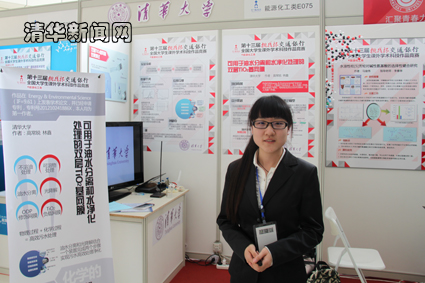 图为特等奖作品《可用于油水分离和水净化处理的双层TiO2基网膜》的展示现场及答辩作者。