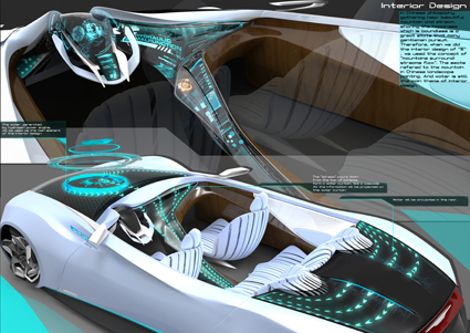 内饰是体现“东方奢华”概念的主体部分,应既奢华又兼具东方精神。在内饰的处理中,吴雨练认为应该对“流觞曲水”的概念进行延伸,拟态出相匹配的环境,从而构成内饰的基本格局。刘可风在研究了中国古典家具、古代生活方式和新材料的技术后,建议采用纯木和水的搭配来体现东方韵味。他们将居于车内的新兴高收入群体定位为当今时代的“君子”,《礼记·曲礼》中有:“博文强识而让,敦善行而不怠,谓之君子。”“君子”是一种理想的人生状态,宠辱不惊,诗意栖居。道德上诉求于儒,心性上回归于道。吴雨练二人设想,在新型高收入群体繁忙的工作之余,他们的私人轿车应能担负起除了身份符号以外的情感功能,即提供一处堪比世外桃源般安然放松的场所,从而诠释出具有东方精神的奢华概念。