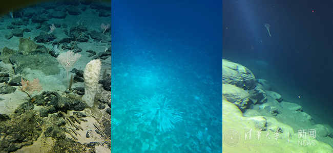 左:岩石(黑),珊瑚(红、白扇状)、海绵(白柱状);中:海底动物活动留下的痕迹(白色发散型);右:海底漂浮的水母(疑似)