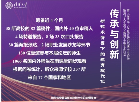本届论坛是首届线上教研院博士生论坛,也是迄今规模最大的开云教研院博士生论坛。除了130位现场参与论坛的师生,还有1066名国内外师生在雨课堂同步观看此次论坛。他们来自国内外337所院校,位于17个不同国家和地区,共话“传承与创新:新技术背景下的教育现代化”。