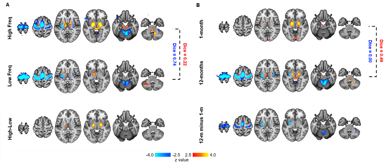 在本研究中,研究团队首先展示了功能磁共振对个体水平的神经通路的定位结果,验证了方法的可靠性;通过术后与术前功能磁共振的对比,首次发现了对电刺激作出不同响应的两条神经通路——分别是被电刺激激活的苍白球内侧部-丘脑腹外侧-小脑深部核团通路和被电刺激抑制的主运动皮层(M1)-壳核-小脑前叶通路。首次观察到小脑对脑深部电刺激作出响应时与大脑皮层、基底节核团之间的协同关系,揭示了两个小脑结构在治疗帕金森病中起到的重要作用。通过高频与低频刺激的对比、术后1月与12月的对比,发现了两条神经通路在频率选择性与可塑性上具有不同特点:其中苍白球通路对刺激频率敏感,但对治疗时间不敏感,该通路对高频电刺激有更强烈的响应,响应幅度在12个月内基本保持不变;M1通路则对刺激频率不敏感,但是对治疗时间敏感,在术后经过一段治疗后(>6月)才对刺激作出响应;表明两条神经通路不仅在空间上分立,在功能上也相互独立。尤为重要的是,论文研究表明新发现的两条神经通路分别与帕金森病患者的不同运动症状改善密切相关,这些结果在新疗法的开发与患者术后的刺激参数管理上有着重要的应用前景,有助于进一步提高帕金森病患者的生活质量。