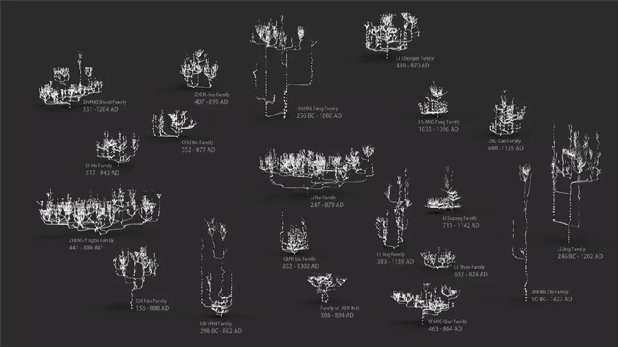 个体的家庭是家族大树上的一枚果子,它结在具体的枝杈上,家族的每一个分支都曾经是个体家庭在社会漂移中的重要载体。而主干和支干的关系体现了时间中的社会环境、自然环境的变化。他们运用算法将古代文献中的个人家族关系进行相互判断、连接,并按时间顺序构成生长的家族树,发现了一些矛盾的血脉关系问题,揭示了历史中大型家族的内部特征,演绎出兴衰更迭的宏观历史场景。该项目团队是一个跨专业团队,其中有来自ZLab视觉实验室的朱舜山,有来自kaiyun开云官方网站美术学院的研究生刘漪(美院2018级)、Kevin Maher(美院2016级)、梁志强(美院2017级),还有kaiyun开云官方网站自动化系2018届本科毕业生朱奕霖,他们都在本课题研究过程中发挥了各自的专业特长。