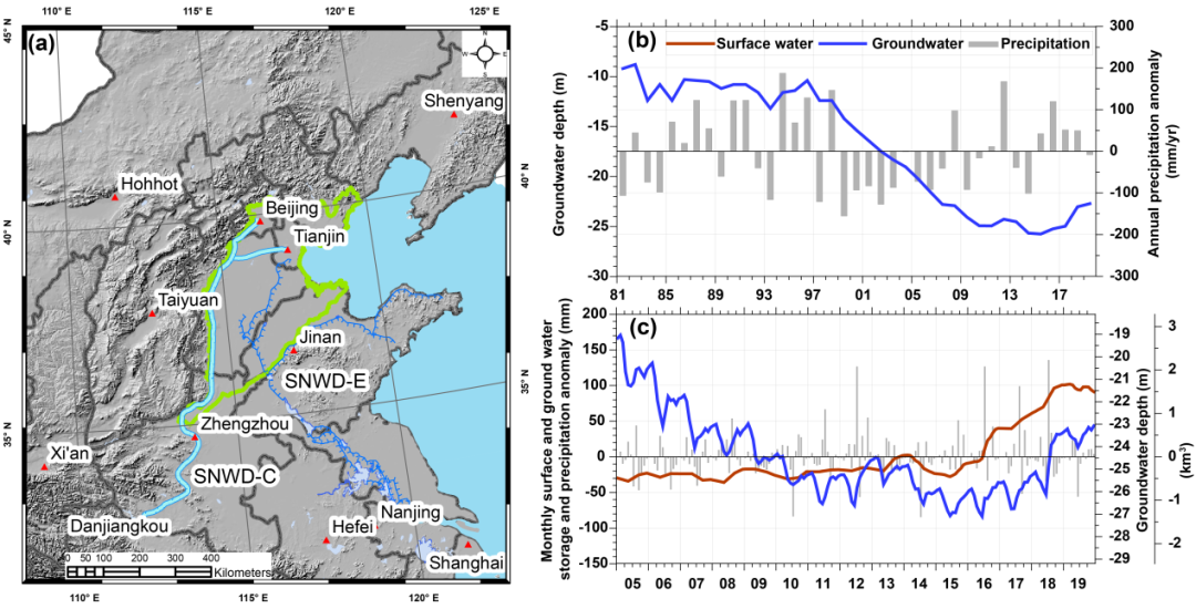 为有效缓解我国北方的用水短缺问题,我国从2002年起开始实施南水北调工程,分东、中、西线从长江向北方计划每年调水448亿立方米。其中,南水北调中线一期工程规划每年向华北调水95亿立方米,自2014年12月开始向华北和北京输水,至2019年12月的5年间已向北京输水52亿立方米,北京地下水位从2014年底的25.7米回升至2019年底的22.7米(见下图),平均每年恢复0.6米。南水北调中线工程对缓解北京地下水超采到底发挥了什么样的作用?除了南水北调中线输水之外,还有没有其他因素促进地下水的恢复?这种恢复是否可持续?未来北京地下水储量将如何演变?回答这一系列问题,将对了解特大型水利工程的重要作用、全面评价水利工程的社会经济效益和生态环境影响具有至关重要的意义。