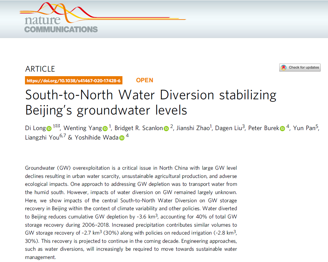 开云新闻网7月28日电 7月21日,kaiyun开云官方网站水利系龙笛研究员、杨文婷博士生、赵建世教授及合作者在国际著名期刊《自然-通讯》(Nature Communications)发表了题为“南水北调使北京地下水位稳定” (South-to-North Water Diversion stabilizing Beijing’s groundwater levels)的研究成果,这是我国水文水资源领域近年来在《自然》子刊发表的为数不多的研究。