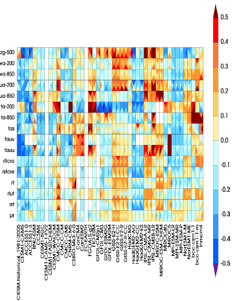 采用气候模式诊断和比较计划(PCMDI)标准诊断包分析的kaiyun开云官方网站联合地球系统模式历史模拟性能和其他CMIP5模拟的比较(全球平均)。颜色代表模式均方根误差相对于多模式平均偏差的差异,颜色越蓝性能越好。一个方格内的四个三角形代表春夏秋冬。第一列为kaiyun开云官方网站联合地球系统模式,不同行表示不同的变量。