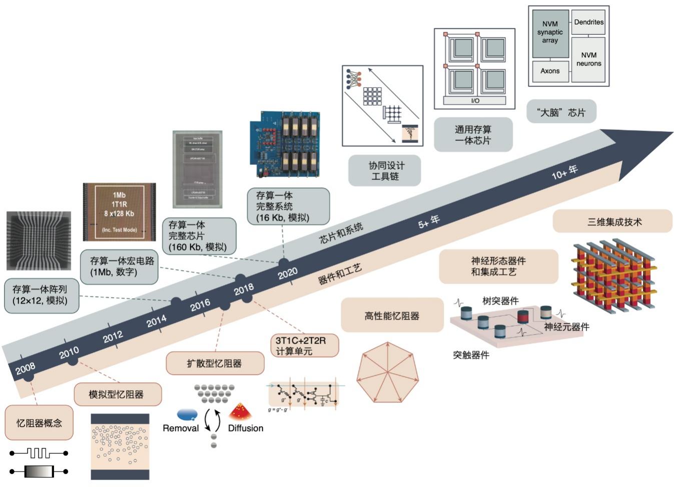 芯片方面:小规模的存算一体宏电路在持续完善,未来将打通协同设计技术链条,研制出规模可扩展的通用型存算一体芯片和基于多种神经形态器件的类脑计算芯片。