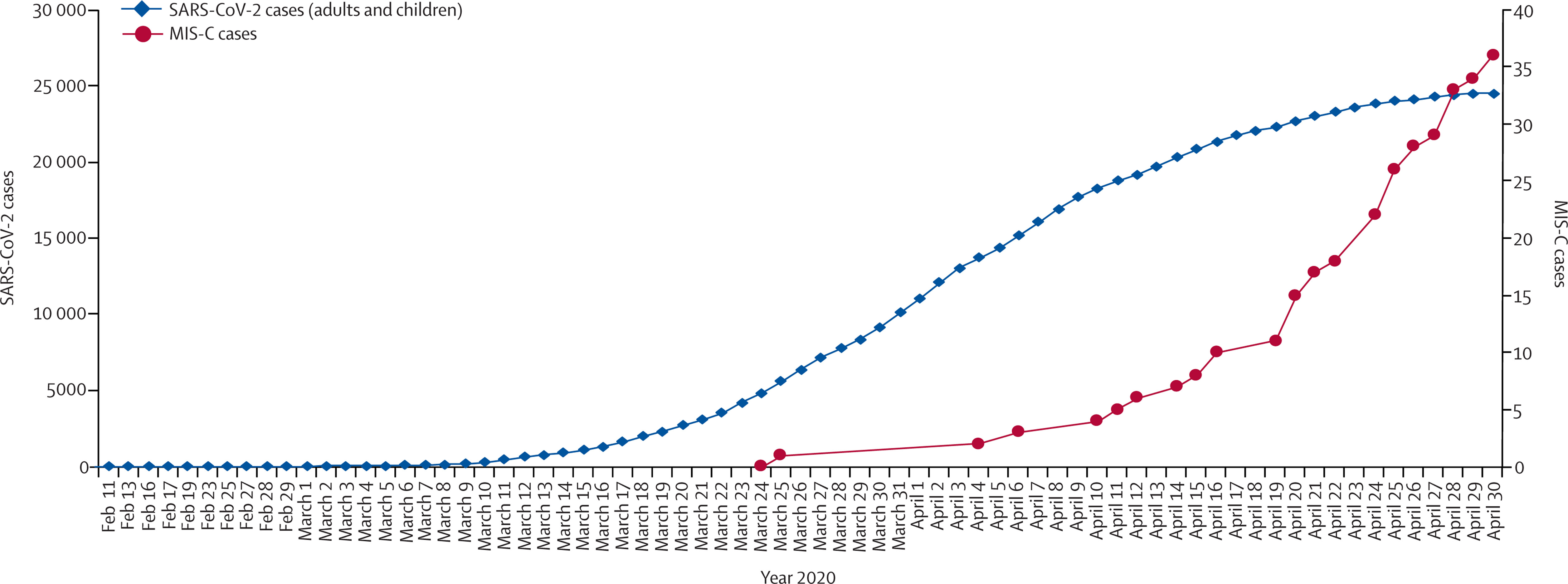 本文回顾了截至2020年7月全球报告的28个MIS-C病例系列研究,总结了MIS-C的流行病学特点和临床特征,并将其与具有类似临床表现的其他儿童常见炎症综合征进行了鉴别比较,后者包括川崎病、川崎病休克综合征及中毒性休克综合征等。文章发现,英国、美国和法国等国报告的儿童多系统炎症综合征都出现在人群感染新冠肺炎病毒高峰期后的一个月左右,且大多数报告的病例都处于既往感染过新冠肺炎的状态,而非正处于急性感染期。MIS-C病例相对于大流行曲线的延迟出现,通过RT-PCR检测出的SARS-CoV-2病毒阳性的病例比例较低,而新冠病毒抗体阳性的病例比例较高,这些特征表明该炎症综合征可能不是由病毒直接侵袭所造成的,而更倾向于与SARS-CoV-2的获得性免疫反应相关。