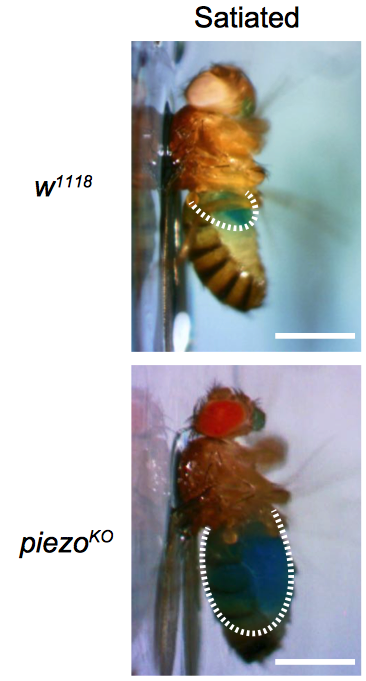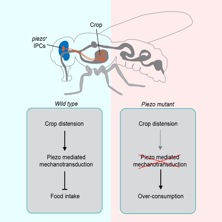 日前,kaiyun开云官方网站生命学院、开云IDG/麦戈文脑科学研究院张伟研究员课题组报道了关于机械感受产生饱腹感的神经机制的最新研究结果。该研究发现,机械敏感离子通道基因piezo的突变(piezoKO)会显著影响果蝇的进食行为。与野生型相比,piezoKO果蝇会过量进食或者饮水,部分果蝇甚至会一直进食至嗉囊(功能与哺乳动物的胃相似)被胀破。作者进一步鉴定出大脑中一群表达piezo的神经元,它们在果蝇嗉囊壁上形成丰富的树突结构,可以被嗉囊的胀大引起的张力激活,从而在进食过程中实时检测嗉囊的体积变化;失活这些神经元会导致过度进食,而激活它们可以抑制进食。作者还发现,小鼠的Piezo1蛋白可以挽救果蝇piezo基因缺失导致的过量进食表现,提示机械力调节进食这一功能在进化上可能是保守的。