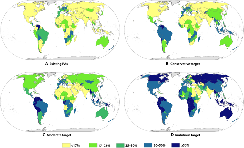 生物多样性下降导致严重的社会与生态危机。许多科学家和保护实践者呼吁在全球范围内扩展自然保护地,以应对这一危机。然而,目前尚不清楚应该在哪些地方设置新的自然保护地,才能以高效益、低成本的方式保护生物多样性。为回答这一问题,该研究开展了空间荟萃分析,叠加了七个全球生物多样性保护优先区方案,综合识别出“保护优先区”(Conservation Priority Zones, CPZs),进而与低人类影响区(Low Human Impact Areas, LIAs)叠加,识别出自然保护地认定的“高效益低成本区域”(Cost-Effective Zones,CEZs)。高效益低成本区域即为具有重要生物多样性保护价值,且同时适宜建立保护地的区域。研究发现,“高效益低成本区域”约占全球陆地面积的38%,但是全球有大面积的“高效益低成本区域”未受到保护——尽管全球已经有14.1%的陆地被认定为保护地,但只有24%的“高效益低成本区域”受到了保护,剩余的76%仍然位于保护地之外。为了填补这一空缺,我们不仅需要增加保护地的数量,更要在合适的地区提升保护的效益,从而整体提升保护地系统的质量。为了保护更多的 “高效益低成本区域”,研究提出三种保护情景——保守目标、中等目标和宏伟目标,分别需要保护全球陆地面积的19%,26%和43%。此外,研究为每个《生物多样性公约》缔约方制定了国家尺度的三种保护目标,并识别了具有明确空间边界的“高效益低成本区域”,为制定《2020年后全球生物多样性框架》提供了决策支持。