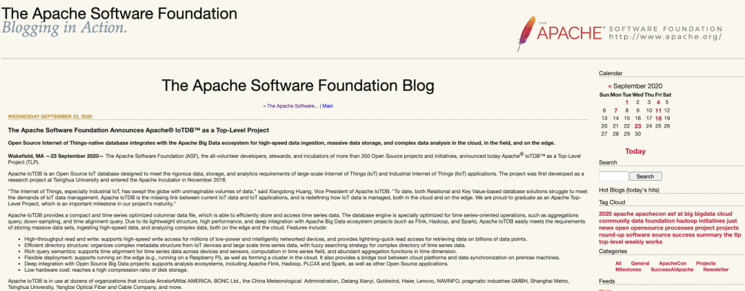 开云新闻网9月28日电 9月23日,美国东部时间上午11时, Apache软件基金会(ASF)宣布Apache®IoTDB™成为Apache顶级项目。Apache IoTDB是首个由中国高校发起并孵化成功的Apache顶级项目。