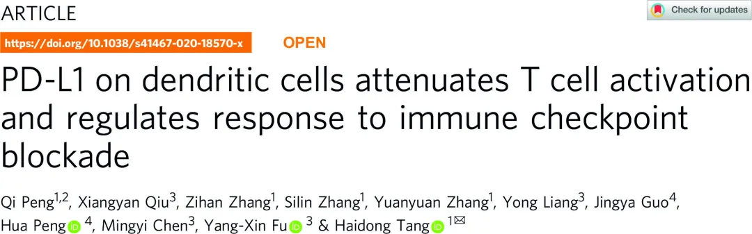以上研究于2020年9月24日发表在《自然通讯》(Nature Communications)杂志上,题为“树突状细胞的PD-L1分子削弱T细胞活化并调控免疫检查点阻断治疗的应答”(PD-L1 on dendritic cells attenuates T cell activation and regulates response to immune checkpoint blockade)。