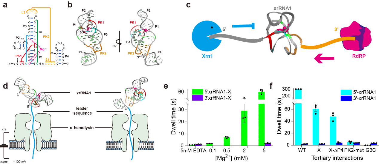 近年来,人们对一类来源于黄病毒的抗核酸外切酶RNA(xrRNAs)产生了浓厚兴趣。xrRNAs位于黄病毒基因组RNA的3’非翻译区,其形成的独特的环状结构(图1a-b)赋予了其抵抗宿主5’→3’核糖核酸外切酶Xrn1降解的功能,进而导致在被黄病毒感染的宿主细胞中,存在大量的基因组RNA不完全降解而形成的亚基因组RNA (sfRNA)的积累,后者在病毒的致病性和免疫逃逸上发挥重要作用。与此同时,在黄病毒的复制过程中,RNA依赖的RNA聚合酶(RdRP)需要从3’→5’方向解开xrRNAs结构作为合成负链RNA的模板以保证病毒的正常复制。由此人们推测xrRNAs存在机械稳定性各向异性(图1c),但缺乏实验证据的支持且其中的分子机制尚不清楚。