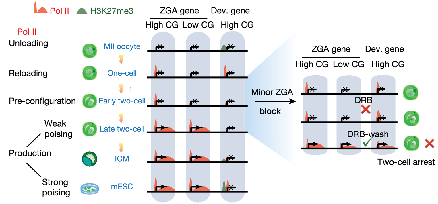 合子基因组如何激活,是发育生物学中重要的科学问题之一。之前的研究表明,几乎所有已研究的物种的成熟卵母细胞均处于转录沉默状态。受精后,基因组仍然在一段时间内保持沉默,而在受精卵分裂到一定时期后(比如小鼠在2细胞晚期,人在8细胞时期),基因组迅速激活并完成,同时母源积累的RNA逐渐降解,最终完成从母源转录组向合子转录组的转变。合子基因组的激活通常经历两个阶段,即初级ZGA(minor ZGA)与主要ZGA(major ZGA)。在小鼠早期胚胎发育过程中,初级ZGA起始于在一细胞中晚期,主要转录一小部分基因和一些重复序列。后来的研究表明基因组中还大范围存在微弱的转录活性,并产生一些没有正常PolyA加尾和剪切的低水平转录本。主要ZGA则发生在二细胞晚期,表征为大量基因的正常激活。有趣的是,通过药物抑制初级ZGA的发生,会引起合子基因不能正常激活,以及胚胎发育阻滞在二细胞阶段。ZGA为什么不在受精后立即开始,而需要等待一段时间?初级ZGA为什么对胚胎发育重要?合子基因组激活是如何发生的?由于早期胚胎实验材料有限,这些重要的生物学问题一直没有被很好地回答。