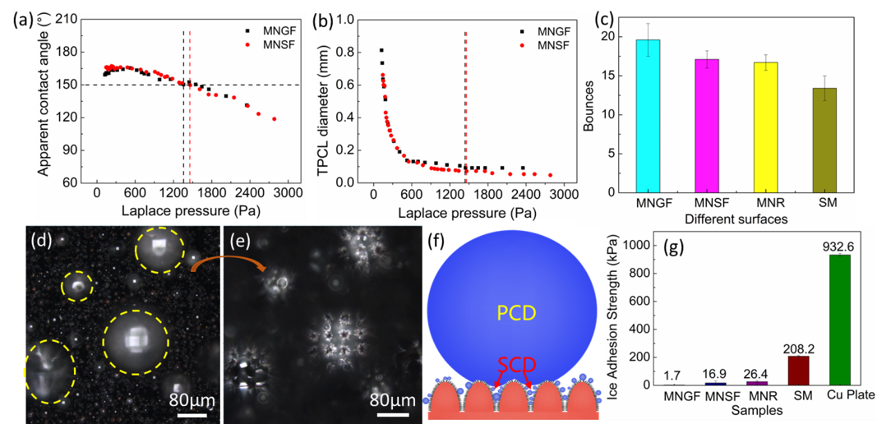 图2 三级微纳超疏水表面的Cassie状态稳定性和防除冰性能表征