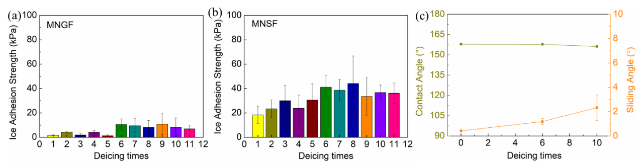 图3 不同超疏水表面的疏冰性能:(a)结冰-除冰循环次数对三级微纳超疏水表面冰粘附强度的影响;(b)结冰-除冰循环次数对三级微纳超疏水表面冰附着强度的影响;(c)结冰-除冰循环次数对三级微纳超疏水表面接触角和滑动角的影响