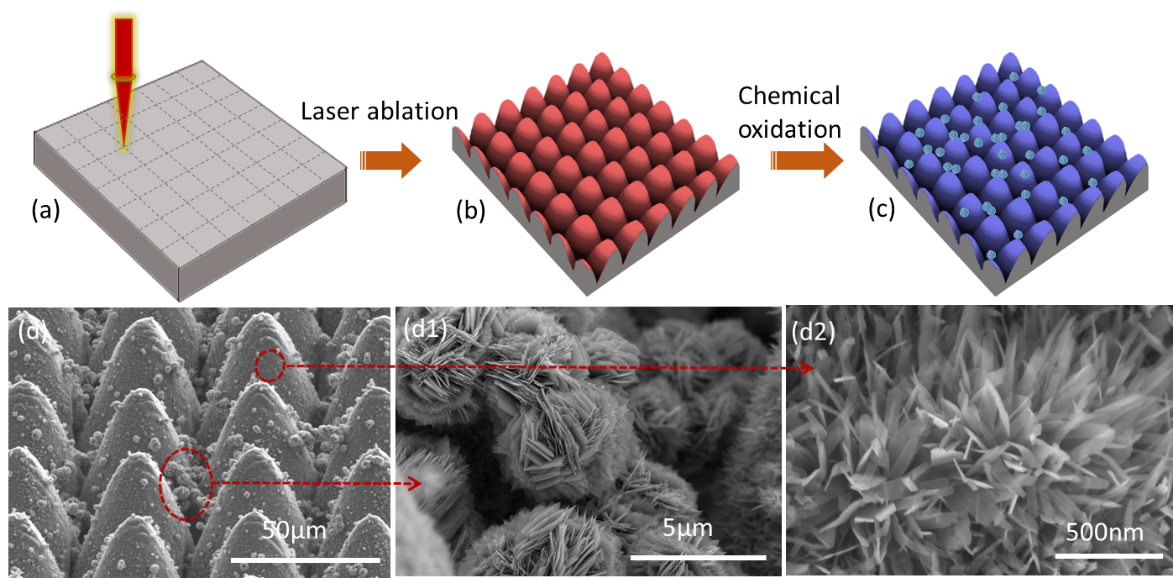 图1 超快激光复合法制备的三级微纳超疏水表面结构