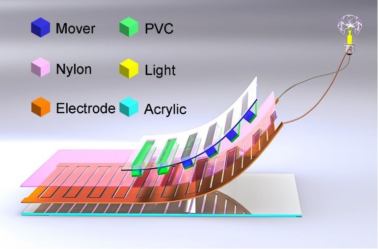 分析上述问题,研究团队发现,如果在背包与重物两者之间加装弹性减震装置,则可减小背包行走产生的重物与背包两者之间的相对运动,使得重物相对于地面的位姿稳定,“悬浮”停于空中。不但可以降低负重的不适感,同时,重物与背包之间产生的相对运动则可以直接驱动基于摩擦纳米发电机(Triboelectric nanogenerator,简称TENG)的电能产生单元,输出持续不断的电能,为低功率电子元器件供电。
