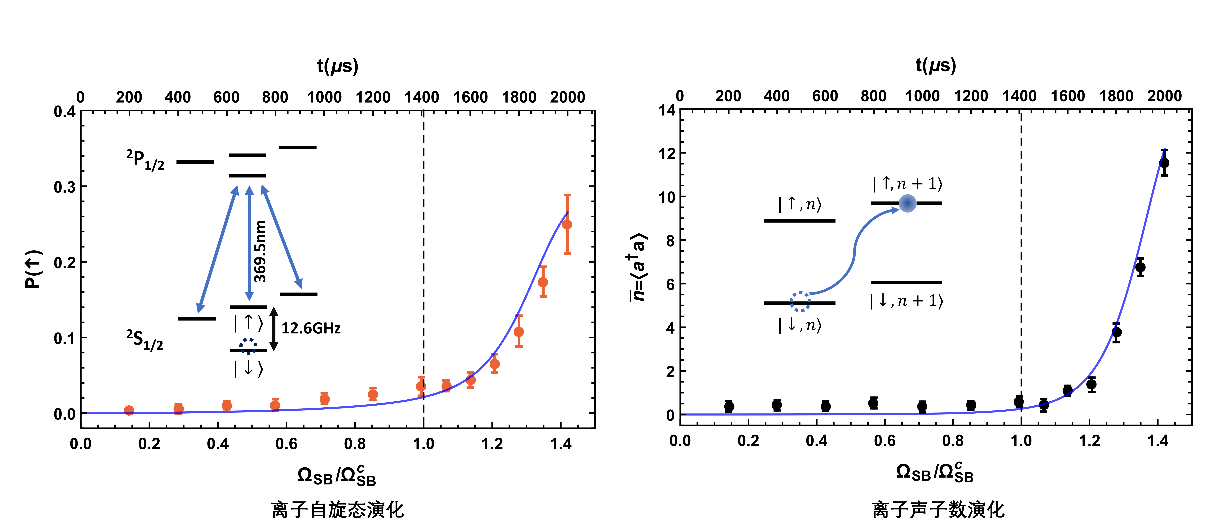 量子相变一般需要多体系统在热力学极限下才能发生,而单离子量子拉比模型可以展示一种新的量子相变,其热力学极限不依赖于无穷多的离子,而是通过某些系统参数的比例趋于无穷来实现。这种新的量子相变近年来在理论上引起广泛关注,但实验中尚未观测到,因为其需要调控量子系统到极端的参数空间。段路明研究组发展了离子的量子调控方法,利用绝热演化和高纯度的态制备,将量子拉比模型推到极端的参数空间,在此基础上观测了两个序参量的变化,包括离子自旋态和描述离子运动的声子数,通过观测序参量的演化,成功获得了该模型存在量子相变的证据。该实验发展的量子调控方法在离子量子计算与模拟中也有重要应用。