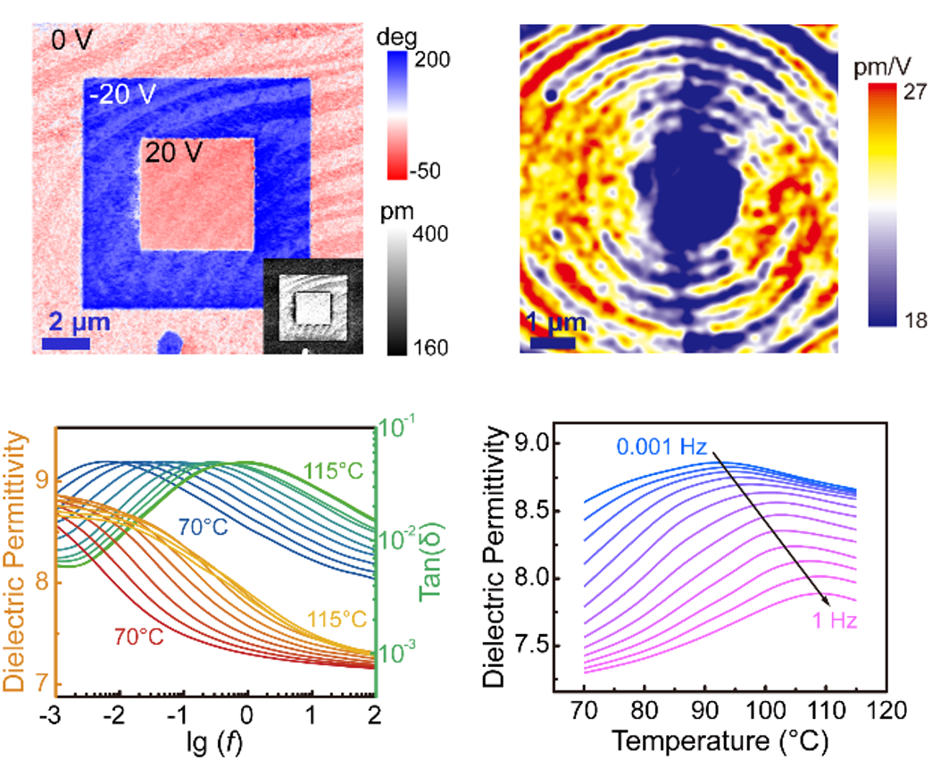 铁电聚合物中平行于主链方向的铁电(左上)、压电(右上)、介电(下)响应