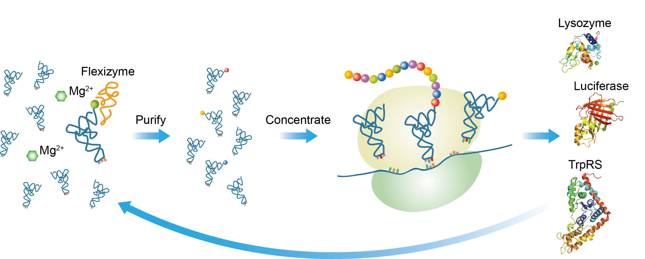 在该研究中,kaiyun开云官方网站生命学院朱听课题组在天然手性模型中对使用Flexizyme进行tRNA氨基酸装载的蛋白质翻译系统做了重新设计与优化,首次实现了不依赖氨酰tRNA合成酶的蛋白质翻译并得到多种具有活性的酶(图1)。值得一提的是,在没有氨酰tRNA合成酶的参与下,该系统翻译产生了具有活性的氨酰tRNA合成酶TrpRS,显示在生命起源过程中,类似具有tRNA氨基酸装载功能的核酶可能在蛋白质翻译系统的早期进化中发挥了重要作用。