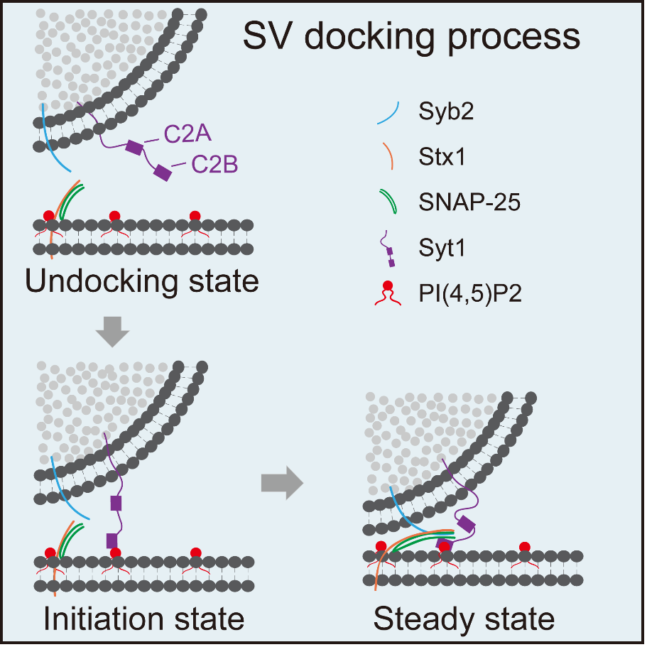 综合来看,本项研究发现Syt1结合PIP2介导了突触小泡的停泊的起始过程,其作用位置位于距质膜约12 nm处,该过程不依赖于SNARE复合物,且优先于SNARE复合物的形成。通过这一研究,作者们发现了Docking起始态发生的位置和分子机制,为理解神经递质的释放过程,尤其是理解大脑在受到高频生理刺激时神经元保持快速高效的响应,作出了重要贡献。