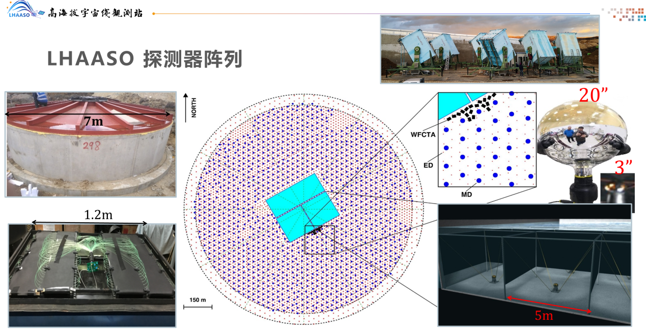高海拔宇宙线观测站(LHAASO)是以宇宙线观测研究为核心的国家重大科技基础设施,位于四川省稻城县海拔4410米的海子山,占地面积约1.36平方公里,采用四种复合探测技术进行全方位、多变量地宇宙线测量,包括:5195个ED电磁粒子探测器和1188个MD缪子探测器组成的一平方公里地面簇射粒子阵列(简称KM2A)、78000平方米水切伦科夫探测器、18台广角切伦科夫望远镜交错排布组成的复合阵列。