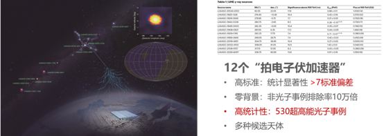 实验发现了12个稳定的银河系超高能伽马射线源,光子能量一直延伸到1拍电子伏附近,伽马光子信号高于背景7倍标准偏差以上,源的位置测量精度优于0.3°,这表明银河系内遍布拍电子伏加速器。
