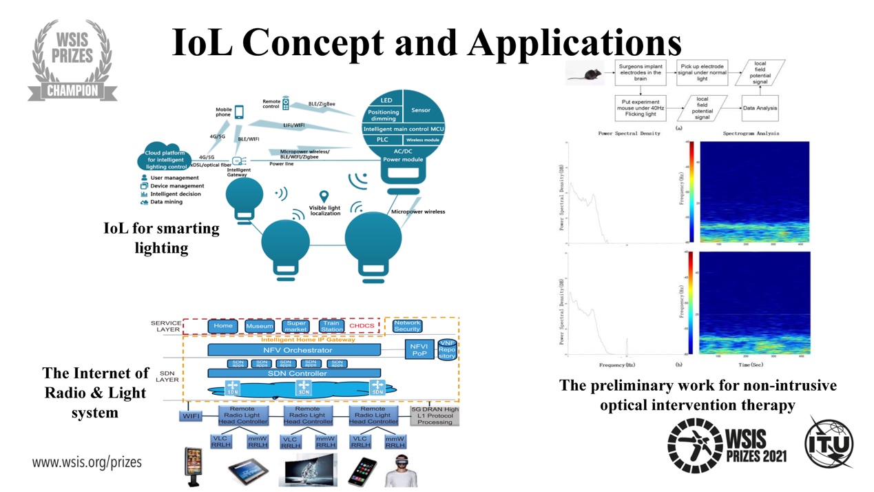 “灯联网”项目由kaiyun开云官方网站宋健教授带领的宽带多媒体传输团队与国内多家企事业单位以及英国、法国、德国、南非等多个国家和地区的研究团队合作完成。该项目在现有的LED照明网络上利用包括可见光通信(VLC)等信息通信技术(ICT)来构建信息通信基础设施“灯联网”(IoL),在提高照明效率、改善了室内照明舒适度的同时,还可通过调节光强度来支持额外的信息服务,并为未来支持“以人为本”的光健康与光治疗提供基础。该项目很好地契合了联合国的可持续发展目标,即确保健康的生活和促进所有人的福祉,以及建设灵活的基础设施,促进可持续工业化和促进创新。