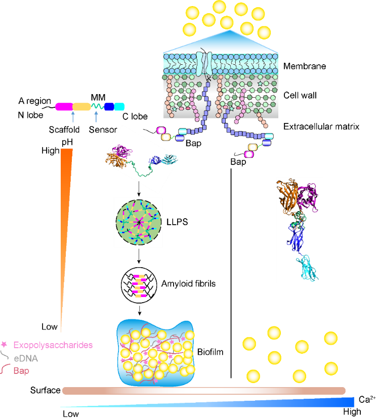 开云新闻网6月3日电 近年来,由多重耐药性金黄色葡萄球菌引起的院内感染已对全人类的健康构成极大威胁。全球每年有近100万人死于无法用传统抗生素治疗的细菌感染,其中,耐甲氧西林金黄色葡萄球菌造成的死亡病例远超过由艾滋病和肺结核引起的死亡病例总和。金黄色葡萄球菌的耐药性往往与其能形成生物被膜密切相关。人们很早就在奶牛源金黄色葡萄球菌中发现一种被称作生物被膜相关蛋白(Biofilm associated proteins)的细胞表面蛋白Bap,Bap在介导葡萄球菌生物被膜的形成中发挥重要作用。Bap是一个多结构域蛋白,全长蛋白含有2276个氨基酸。最近的研究表明,Bap蛋白的N末端在低pH和低钙下易于聚集形成功能性淀粉样纤维,并且促进细菌聚集和生物被膜的形成。然而,Bap蛋白响应环境变化调控淀粉样纤维的形成以及介导生物被膜形成的机制并不清楚。