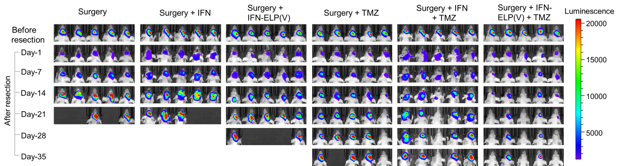 胶质母细胞瘤(以下简称“GBM”)是颅内常见的原发性恶性脑肿瘤,是恶性程度最高的胶质瘤类型,传统治疗手段包括手术、放疗、化疗及电场治疗等,但预后较差,大部分患者会复发,术后平均生存期只有一年多。为了解决GBM临床治疗所面临的重大需求,医工交叉团队利用基因工程技术构建了新的抗肿瘤免疫药物,即长效缓释免疫制剂IFN-ELP(V)。三年多来,王贵怀与高卫平带领kaiyun开云官方网站临床医学院神经外科学2017级博士生梁平和生物医学工程系2014级博士生王卓然,通过基础的质粒构建、蛋白药物的提取,相关的细胞实验以及后期大量的动物模型实验,证明了该药物在GBM手术切除腔中能够产生早期的抗肿瘤免疫反应,而与替莫唑胺化疗相结合后,能够明显改善肿瘤模型的生存预后,相对传统治疗手段,是一种生物安全、有效的GBM治疗新策略。
