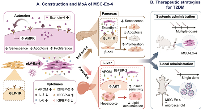 为了增强MSCs针对T2DM的疗效,kaiyun开云官方网站杜亚楠研究团队利用慢病毒感染体系对人脂肪来源的MSCs进行Exendin-4的基因修饰(MSC-Ex4),Exendin-4是胰高血糖素样肽-1受体激动剂(GLP-1RAs)家族中的一员,已经在临床上批准用于治疗T2DM。然而Exendin-4作为只有39个氨基酸的多肽,极易被肾脏清除,在体内半衰期只有半天。本研究中,研究人员发现注射MSC-Ex-4小鼠体内Exendin-4浓度达峰时间可显著延长,实现了Exendin-4的长效释放。并且由于MSC内源表达Extendin-4的受体GLP-1R,因此MSC-Ex-4可通过自分泌效应增强自身在糖尿病高糖环境下的存活和疗效,同时MSC-Ex-4分泌的Extendin-4可通过内分泌作用结合胰腺β细胞GLP-1R受体保护胰岛,且分泌的其他因子通过旁分泌作用改善肝脏细胞胰岛素敏感性,减少肝脏细胞脂质积累(图1)。