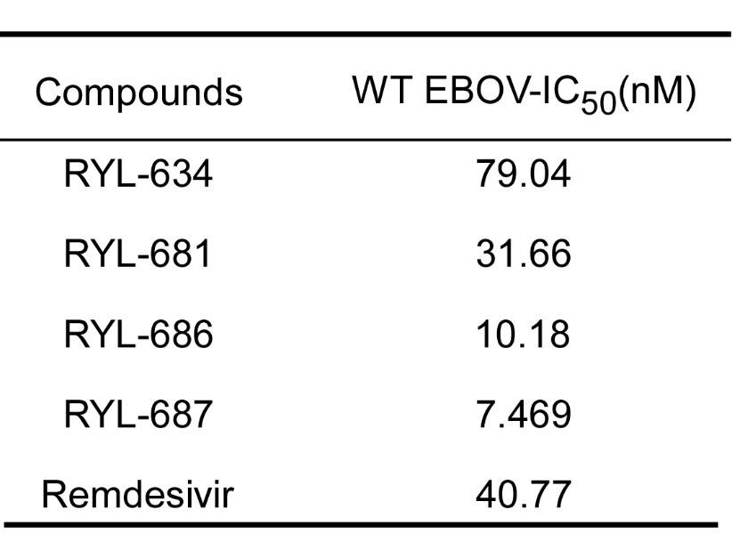 埃博拉病毒的培养需在生物安全4级(BSL-4)实验室内进行,因此大大降低了筛选抗病毒药物的效率。研究团队首先建立了安全可靠且模拟埃博拉病毒复制的细胞模型,对一系列新型的喹诺酮类化合物的抗病毒活性进行筛选,结果表明RYL-687、RYL-686和RYL-681化合物抑制病毒感染的IC50(半抑制病毒浓度)均比瑞德西韦低,并且细胞毒性非常低(图1)。