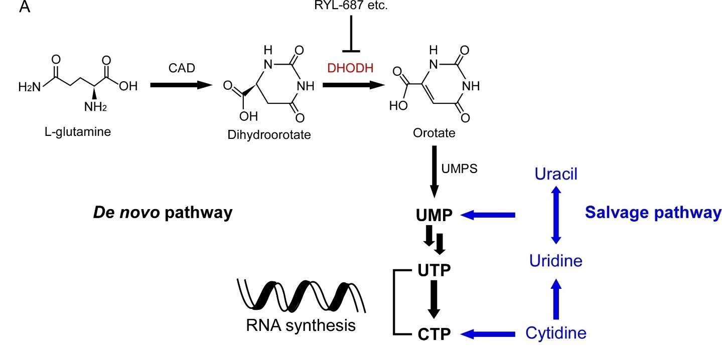 随后,研究团队对有效化合物的作用靶点进行了鉴定(图2)。之前研究表明喹诺酮类化合物可以和“嘧啶从头合成通路”的二氢乳酸脱氢酶DHODH有相互作用。作者通过外源补给 “嘧啶从头合成通路”上下游的代谢产物以及体外酶活实验,证明喹诺酮类化合物通过靶向DHODH发挥抗病毒功能。另外,DHODH还被报道可作为新冠病毒的药物靶点,提示该靶点的广谱抗病毒作用。
