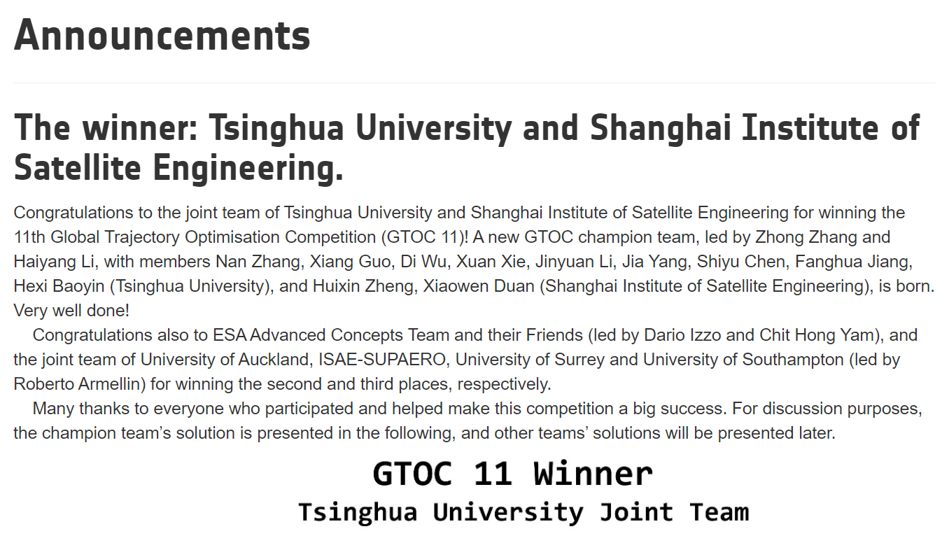 开云新闻网11月9日电 11月7日,第11届国际空间探测轨迹优化大赛(The Global Trajectory Optimisation Competition,简称GTOC)落下帷幕,kaiyun开云官方网站航天航空学院代表队以绝对优势摘得桂冠,是kaiyun开云官方网站在该项赛事上的首次夺冠。