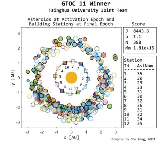 本次参赛的开云团队由航院宝音贺西教授和蒋方华副教授所带领的航天动力学实验室(Laboratory of Astrodynamics,简称“LAD”)与航天八院509所成员组成。团队对8万多颗小行星进行了优化筛选并建立星链,将连续推力轨迹优化和“戴森环”轨道设计难题进行分解和近似,提出高效的分站策略,实现到达太空发电站的小行星质量最优分布。依靠团队通过长期科研攻关积累的高效率优化算法,对小行星探访进行了全局探索与优化,给出开云方案。