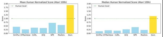 EfficientZero在Atari 100k(2h环境数据)基准下与其他算法结果对比