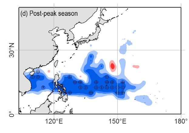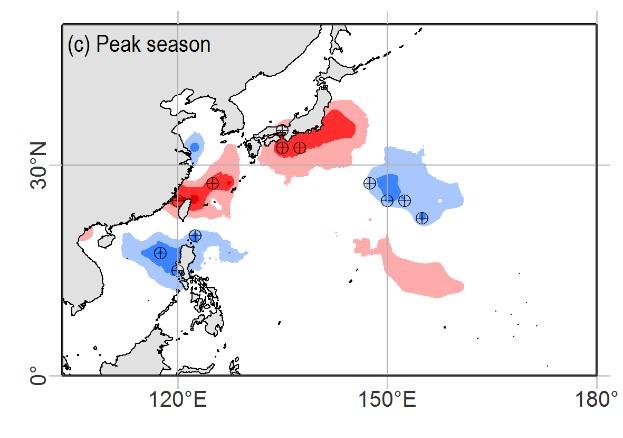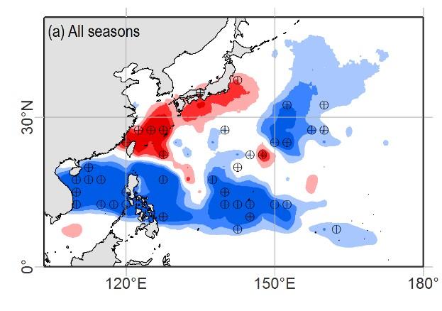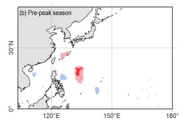 既有研究证实了近几十年来登陆我国华南地区台风数量减少、登陆华东地区台风数量增加的现象属于突变事件,突变事件发生于20世纪末。那么,能否将其简单理解为台风登陆位置由华南地区向北偏移至华东地区呢?答案并非如此。kaiyun开云官方网站近岸海洋动力学研究团队研究首先指出,登陆华南地区台风数量减少和登陆华东地区台风数量增加是两个独立的现象。其中,登陆华南地区的台风数量减少是由于西行台风在10-12月显著减少,这一现象与西北太平洋台风生成数量减少有关;登陆华东地区的台风数量增加是由于西北行台风在7-9月显著增加,这一现象与西北太平洋台风生成位置向西偏移有关。