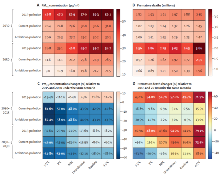 上述研究以“气候目标和清洁空气政策对减少中国未来空气污染健康损失的作用(Role of climate goals and clean-air policies on reducing future air pollution deaths in China: a modelling study)为题在《柳叶刀·星球健康》(The Lancet Planetary Health)在线发表。基于自主研发的排放预测模型,研究团队构建了18组不同力度的气候治理政策和空气污染治理政策组合情景。模拟了各个情景下中国未来PM2.5污染暴露水平变化,并测算了相关键康损失,指出减污降碳协同是降低中国空气污染健康损失的必由之路。研究发现,在人口老龄化背景下,中国人群对空气污染暴露的脆弱性风险持续增加,只有将严格的气候治理政策与空气污染治理政策相结合,充分发挥减污降碳协同作用,才能抵消人口老龄化带来的负面影响,使得空气污染带来的健康损失持续下降,切实保护人群健康。