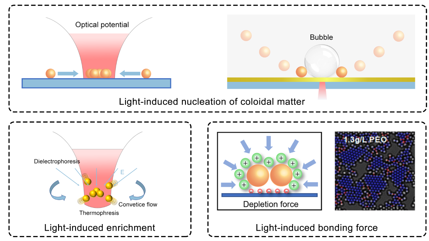 光能够通过光力形成势阱或通过产生气泡提供异质形核界面的方式促进胶体粒子的定点形核。在生长过程中,光能够通过诱发热泳或者引发对流的方式,增强胶体溶液中的传质过程,以加速胶体物质的生长。光能够引发包括光结合力、耗尽力在内的多种胶体粒子间作用力,其中最强的范德华力能够在粒子间产生超过10nN的作用力,这种光致粒子间作用力能够实现可重构或永久的胶体物质(图2)。