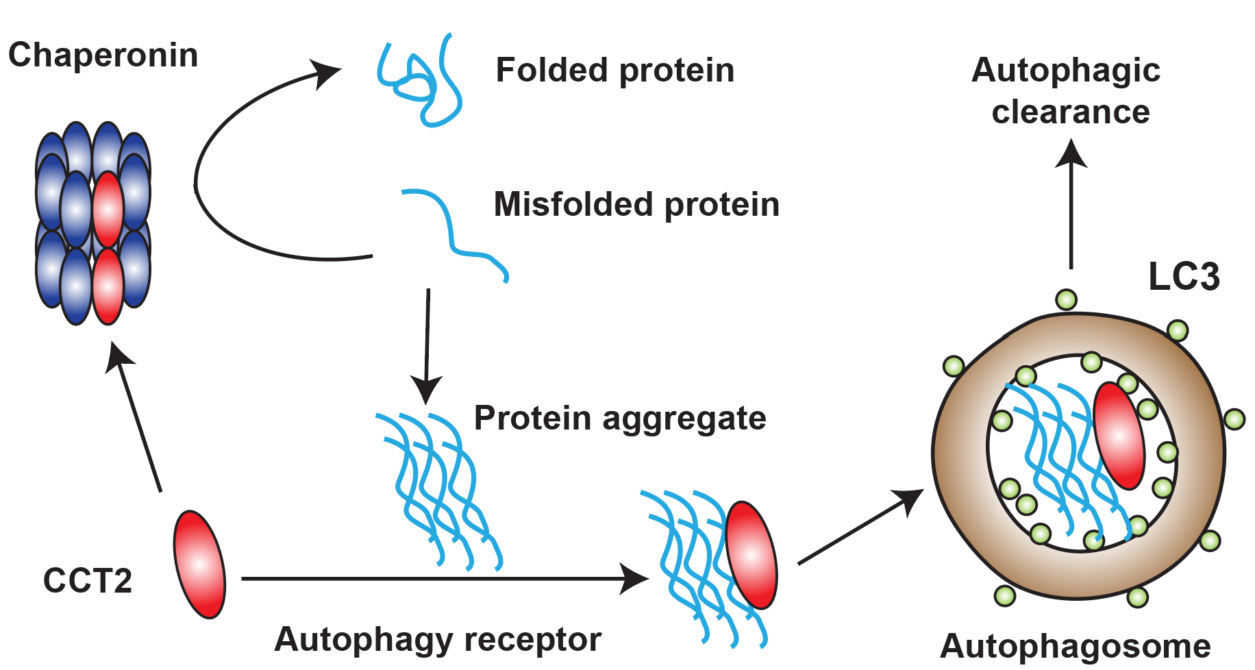 CCT2是分子伴侣Chaperonin复合体的一个亚基,与复合体一起作为分子伴侣帮助错误折叠的蛋白正确地折叠。研究发现,CCT2是以单体形式介导聚集体自噬的,因为只有单体形式的CCT2能够暴露出与LC3的结合位点VLIR结构域。有趣的是,聚集体的存在阻碍了Chaperonin复合体的形成,从而释放出更多的CCT2单体来促进聚集体的清除。CCT2从复合体到单体的转变,使其功能从分子伴侣转变为自噬受体,这既能够在聚集体形成前防止错误折叠的蛋白发聚集,又能在发生聚集后介导聚集体的清除,为维持细胞内的蛋白稳态提供了一种高效的方式(图2)。