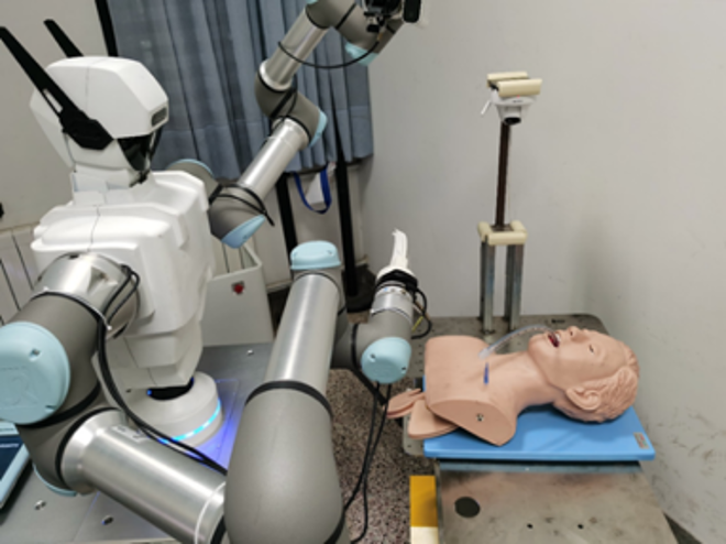 新冠疫情期间,气管插管存在巨大医患交叉感染风险。自主插管机器人系统搭建双臂协同系统,创新设计多功能喉镜,并在此基础上实现三维视觉导航和力-位移-视觉混合控制技术,克服人体狭小空间内三维视觉导航和安全控制的难点。通过模拟医生的操作方式,本项目解决传统技术中心难以兼顾医患安全的问题,优化了插管流程,实现80秒以内90%成功率插管,达到一线医生水平,为后疫情时代的医工交叉提供一条可行的思路。