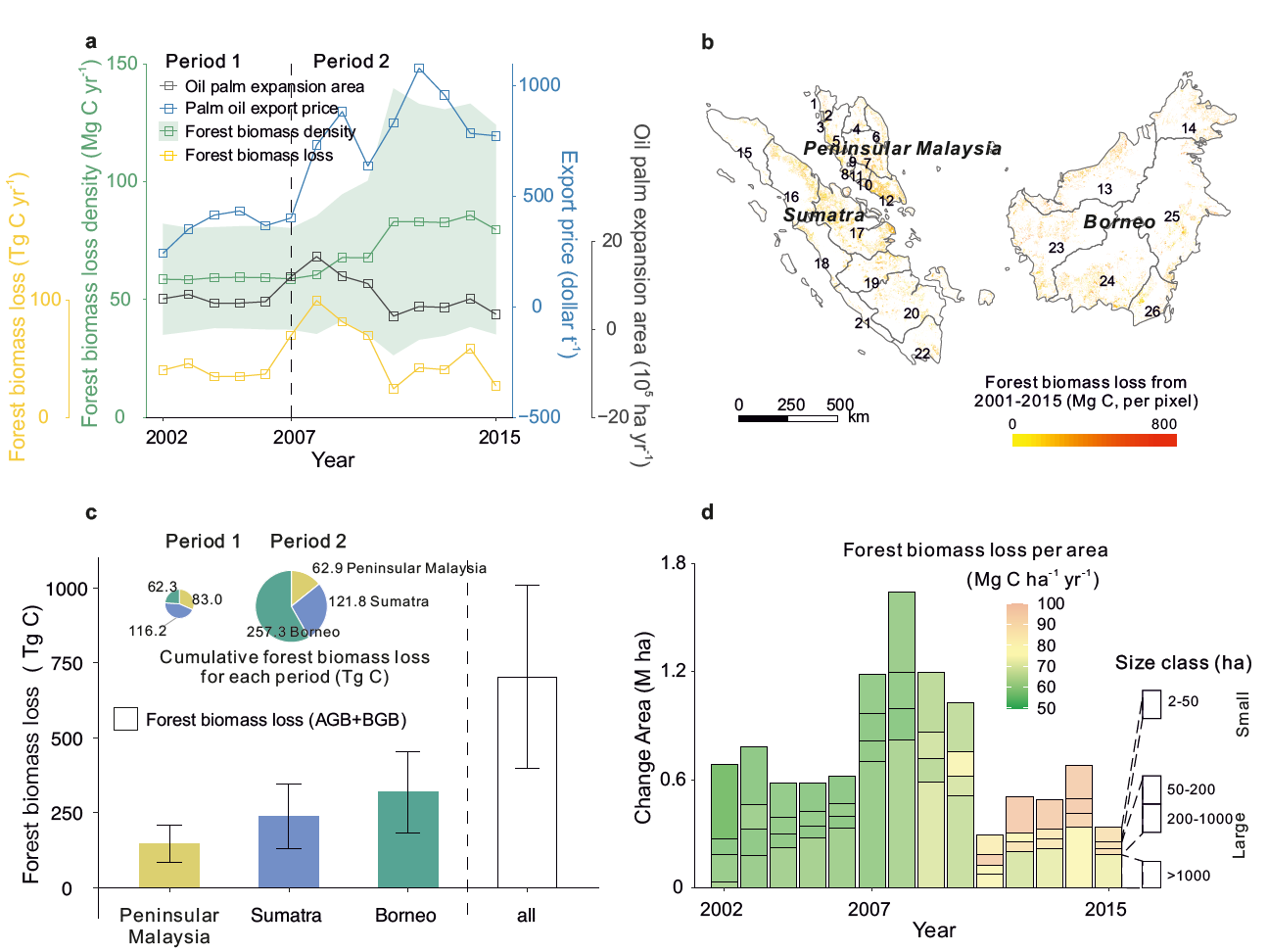 针对上述问题,课题组基于此前发表的马来西亚和印度尼西亚油棕种植园分布数据,结合2010年全球地上生物量数据(Glob Biomass 2010),使用空间替代时间的研究方法,揭示了2001-2015年间马来西亚和印度尼西亚油棕侵占森林引起的植被碳储量变化的时空分布,分析了油棕种植园规模与碳密度变化的关系。