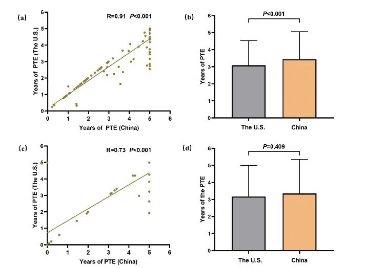 图2.我国和美国PTE计算方法模拟两国创新药的PTE长度比较