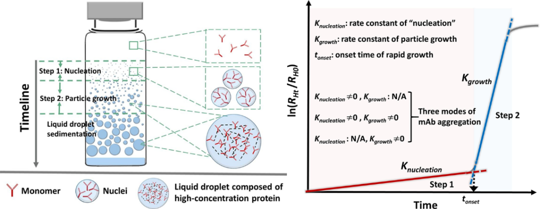 在研究一中,课题组博士生田周从物理化学、胶体科学层面深度探究了影响单抗溶液相分离和聚集的关键结构因子和溶液理化因素。研究发现,单抗分子在相分离过程中以一级动力学规律聚集成核且不断长大并形成高浓度的单抗液滴,最终沉降形成明显的相分离状态。本研究从单抗聚集动力学角度定义了可量化的关键动力学参数,如成核速率(Knucleation),生长速率(Kgrowth)以及核生长起始时间(tonset),用于评估溶液中单抗聚集速率及制剂条件的优劣。