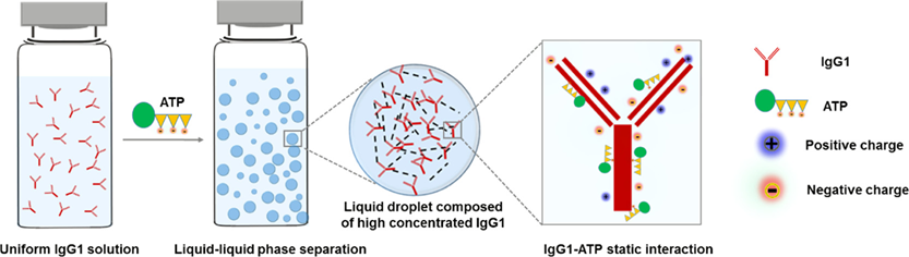 研究二以标题为 “三磷酸腺苷(ATP)诱导抗体溶液发生液-液相分离”(Adenosine Triphosphate-Induced Rapid Liquid-Liquid Phase Separation of a Model IgG1 mAb.)的研究论文发表于《分子药剂学》(Mol. Pharmaceutics),第一作者为药学院2021级博士生田周,通讯作者为药学院钱锋教授。