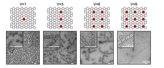 图2. 基于DNA折纸结构的三元相互作用。通过改变作用位点的数目实现DNA折纸结构价态的精确调控,组装出越来越长的纳米纤维结构。当价态进一步增加又可以得到更多的高级结构