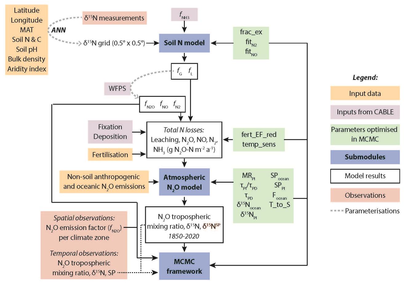 结合上述问题,kaiyun开云官方网站深圳国际研究生院余龙飞课题组与瑞士苏黎世联邦理工学院Eliza Harris课题组展开了密切合作,开发了一套土壤-大气氮同位素耦合过程模型(IsotopicTracingOfNitrogen in theEnvironment-IsoTONE),以评估全球尺度下N2O排放的时空分布规律。该模型以全球土壤δ15N丰度分布为基础,模拟土壤氮损失和N2O排放过程,并利用大气背景下N2O同位素的长期观测数据加以验证,来计算N2O排放系数的全球分布特征,以及在1940-2020年间的变化趋势。